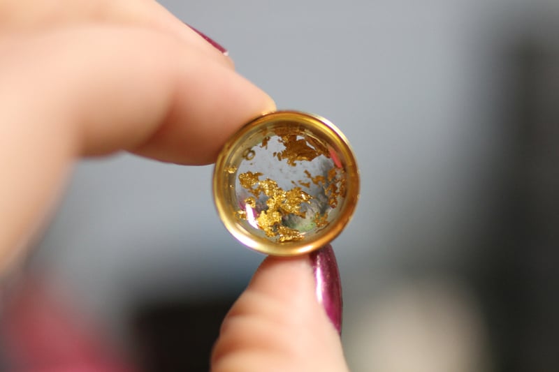 One pair of double flare gold surgical steel plugs with a gold flake fill inside! Please note that in the smaller sizes the smaller/less flakes there will be.