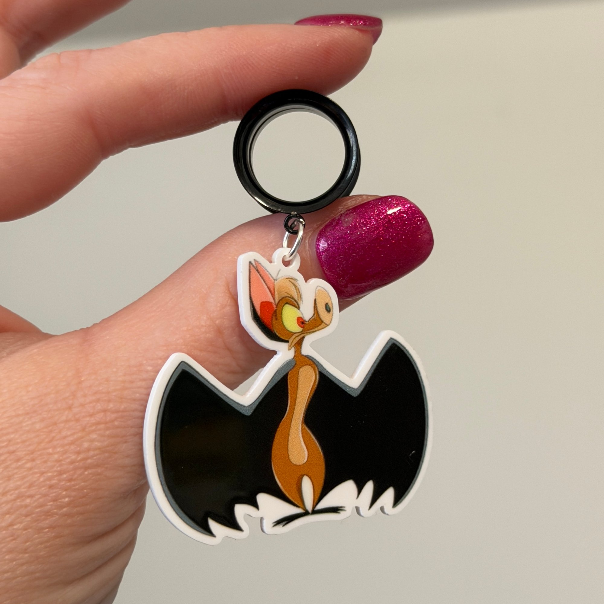 One pair of black surgical steel saddles/tunnels with a Batty dangle!