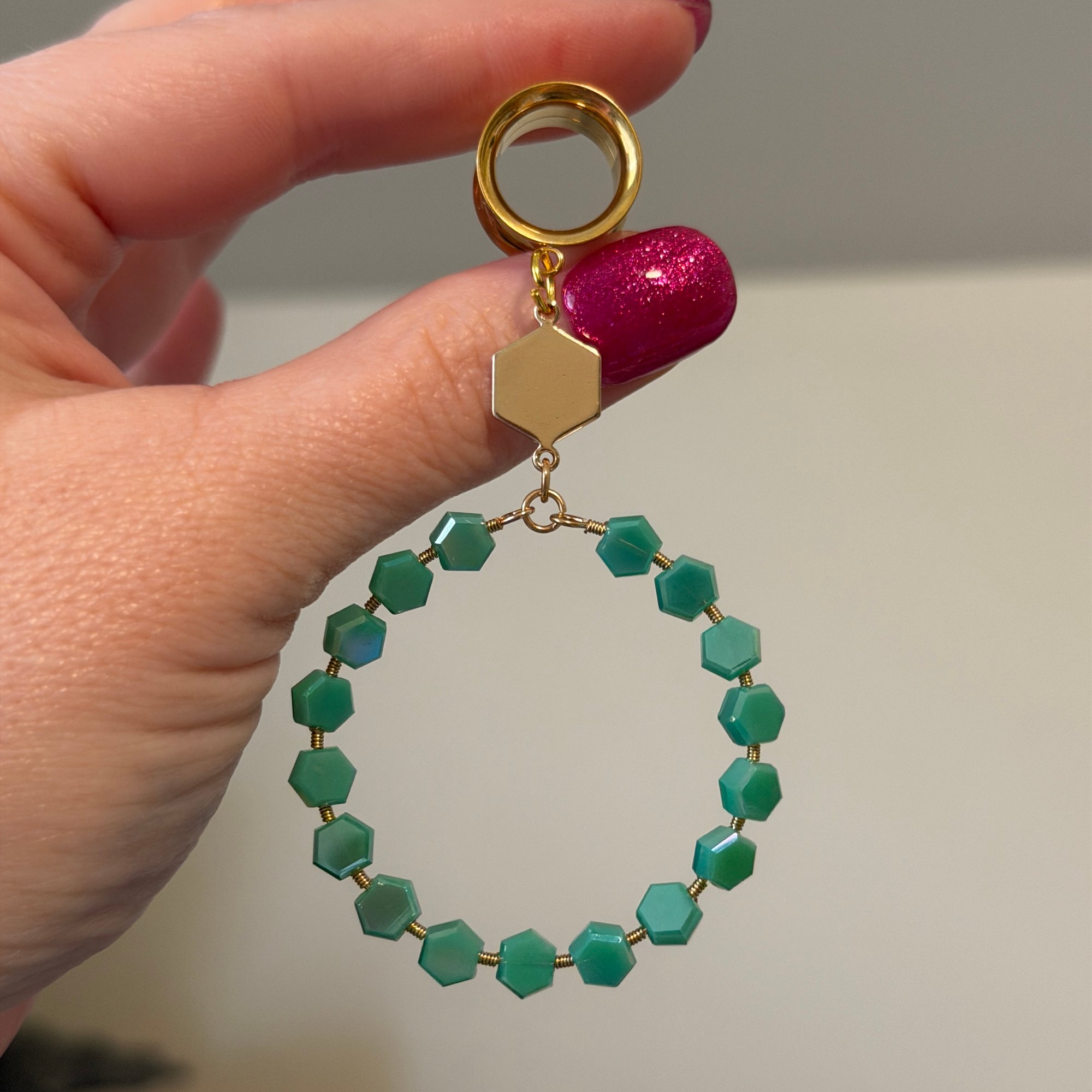 One pair of surgical steel tunnels/saddles with this cute aqua beaded hoop design!