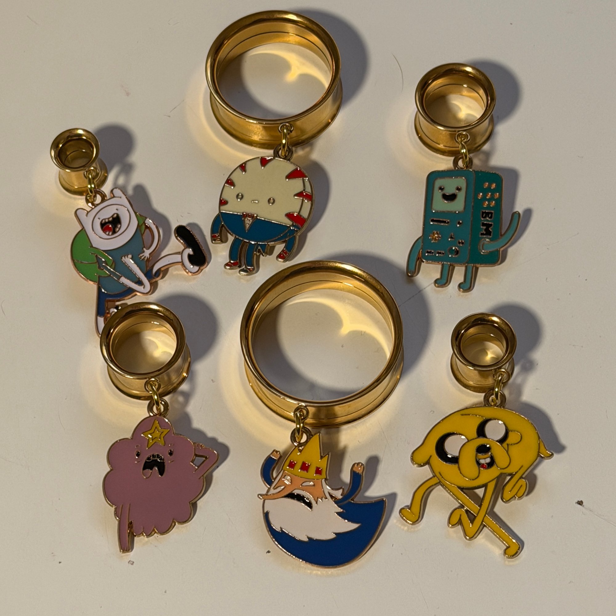 One pair of double flare surgical steel screw back tunnels with your choice of these 6 Adventure Time inspired dangles. These will come standard on gold tunnels but can be made on black upon request.