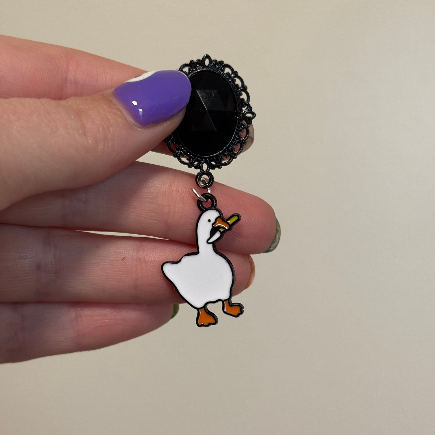 One pair of single flare surgical steel plugs (with o-rings) with a black gem and bird knife dangle!