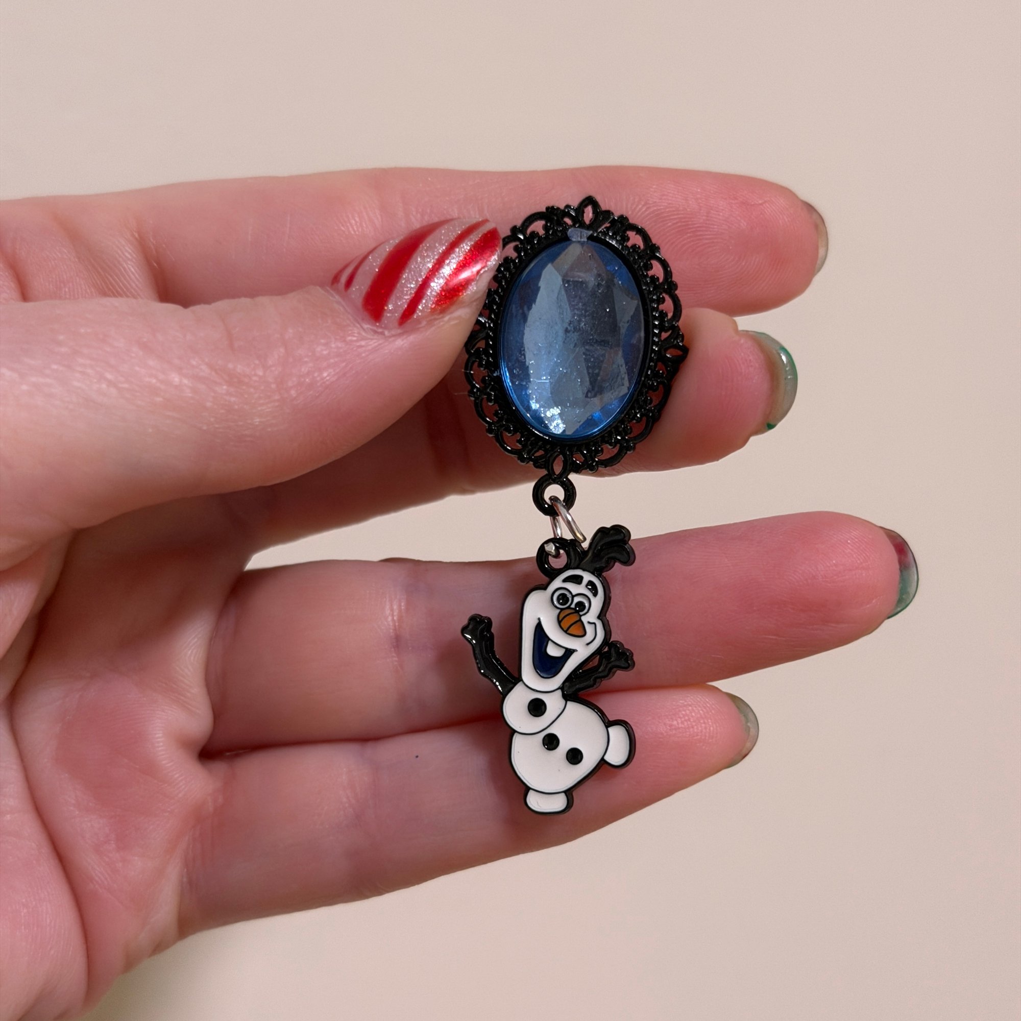 One pair of single flare surgical steel plugs (with o-rings) with a blue gem and snowman dangle!