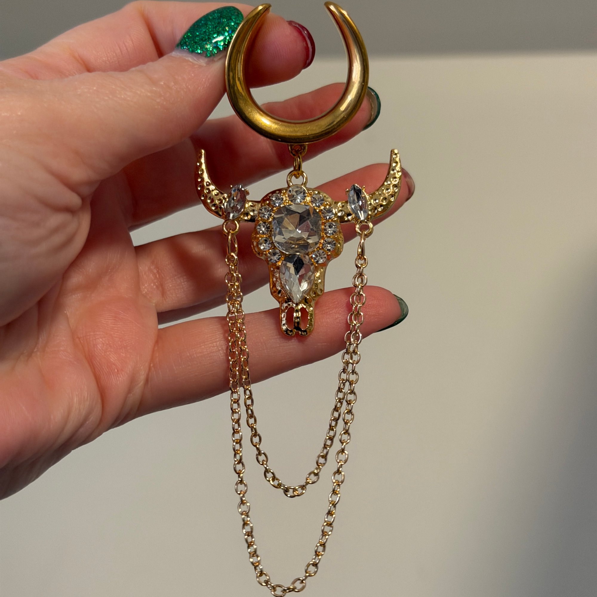 One pair of gold surgical steel saddles with this very cool cattle skull dangle with chains and faux diamonds!