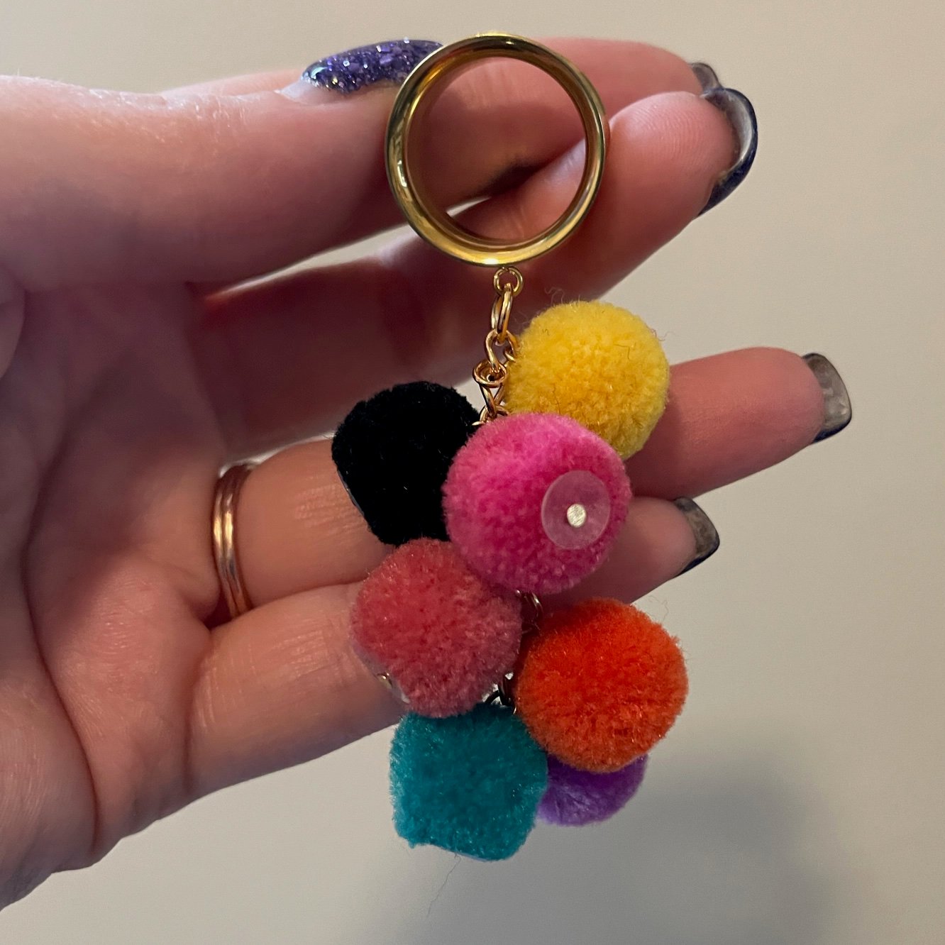 One pair of double flare surgical steel screw back tunnels with this adorable colorful puff dangle design!