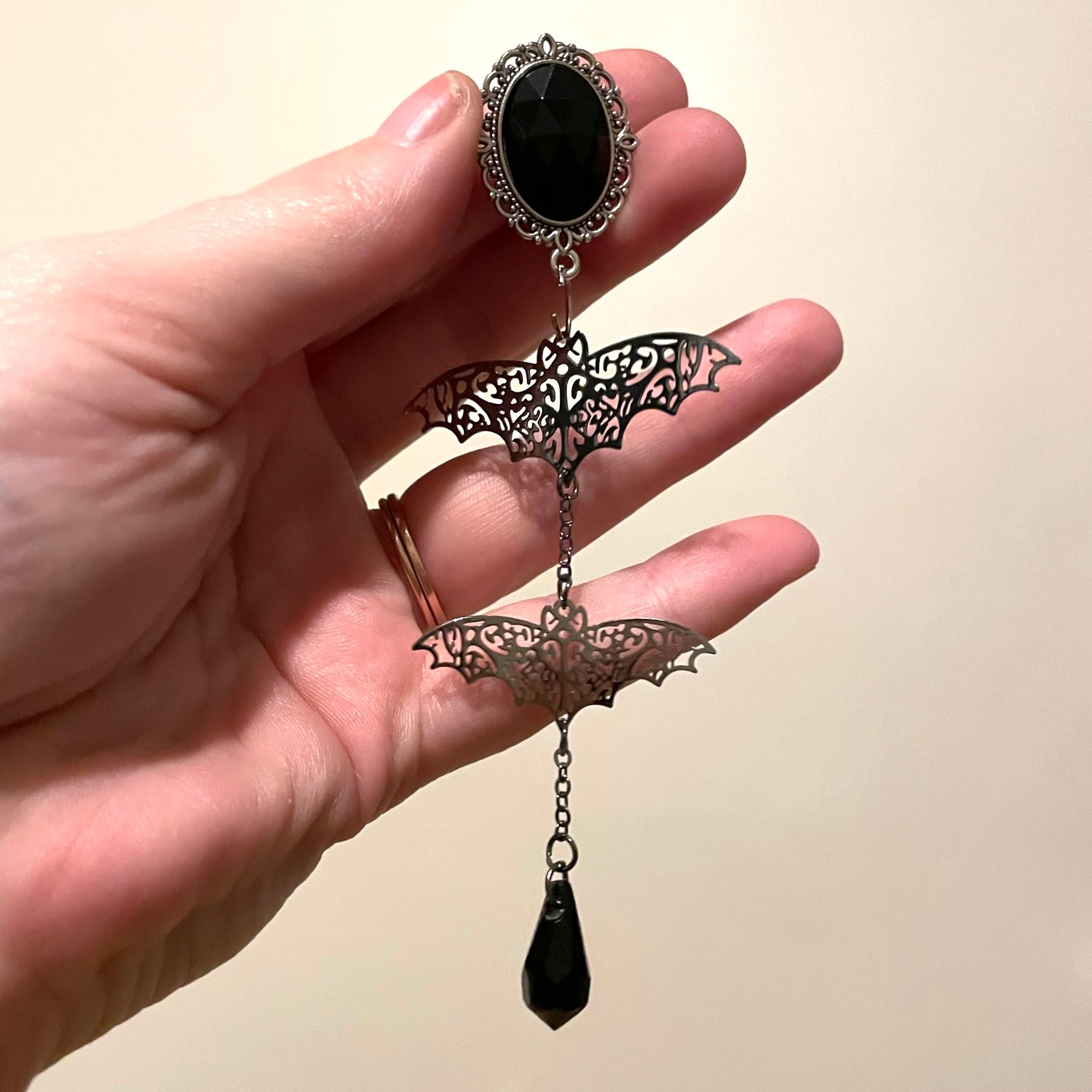 One pair of single flare surgical steel plugs (with o-rings) with this awesome lightweight filigree bat dangle design (they come standard with a black gem but if you'd like another color just contact me). Please note in the sizes 1 1/8-1 1/2 the gem/setting will be round rather than oval. The silver settings may vary slightly by size.