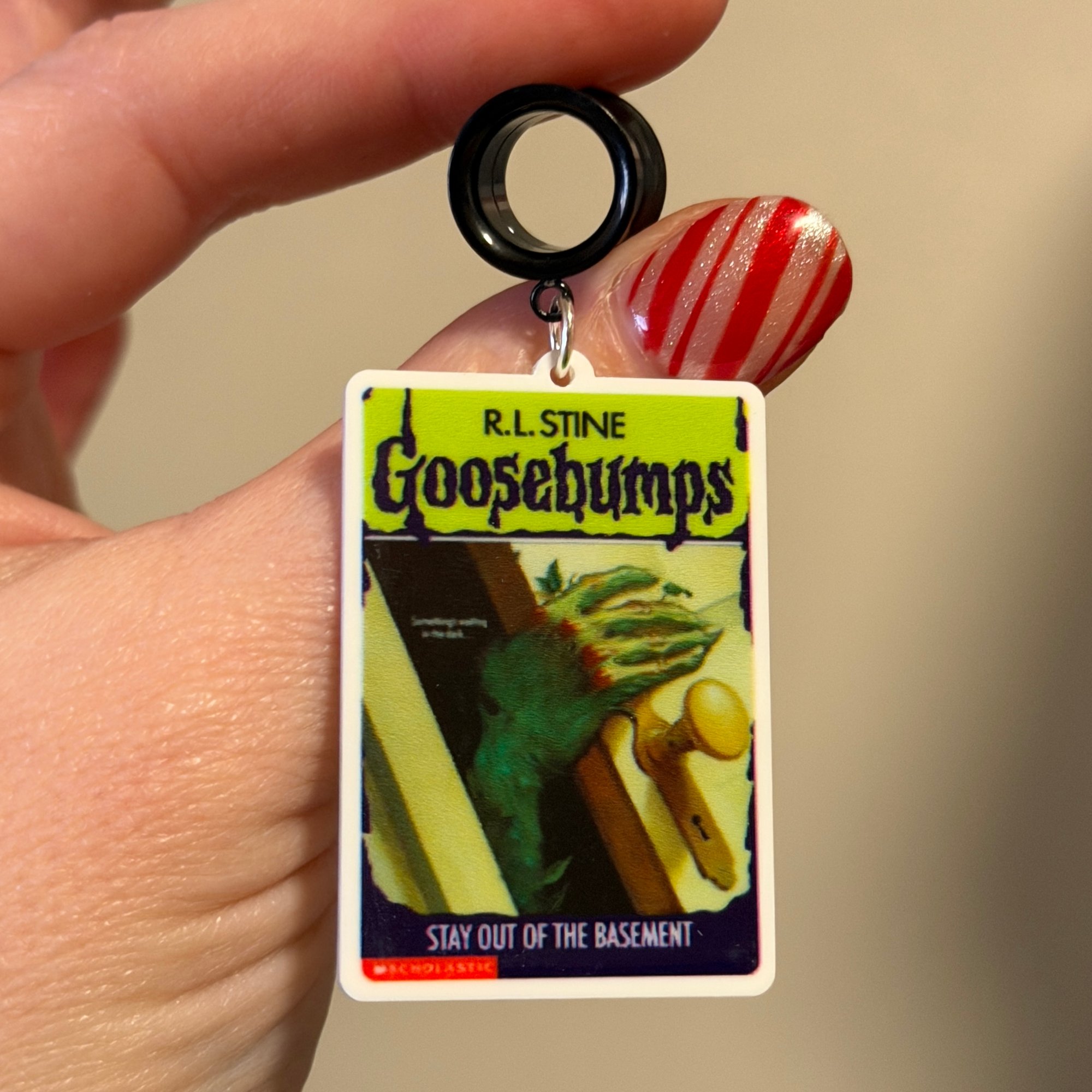 One pair of double flare surgical steel screw back tunnels with cute Goosebumps dangle!