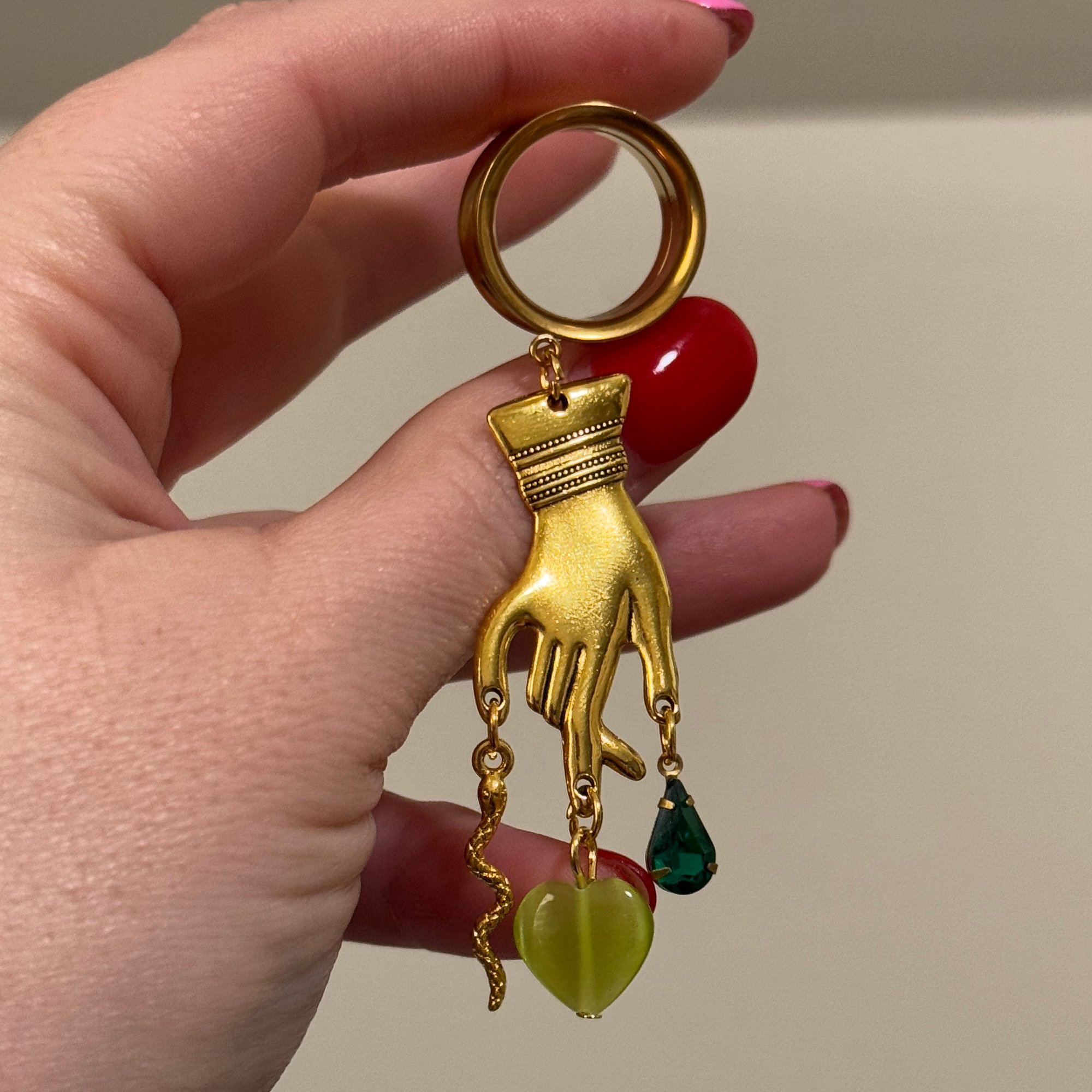 One pair of surgical steel saddles/tunnels with an adorable gold hand with a green heart/snake/green gem dangle!