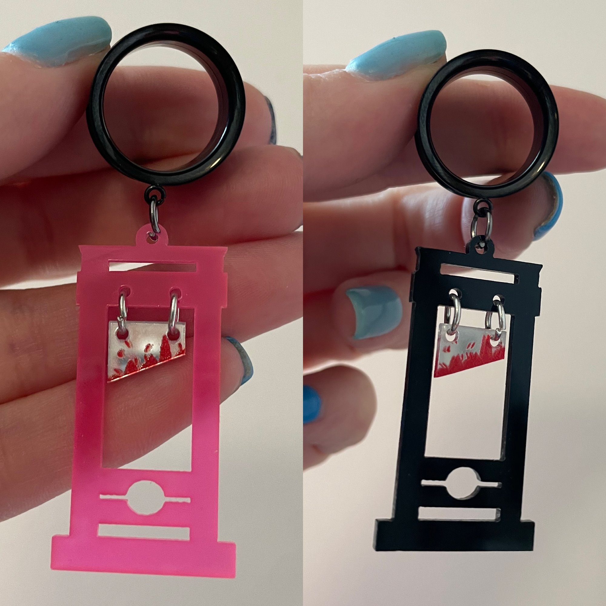 One pair of double flare surgical steel screw back tunnels with this fun black/pink guillotine dangle!