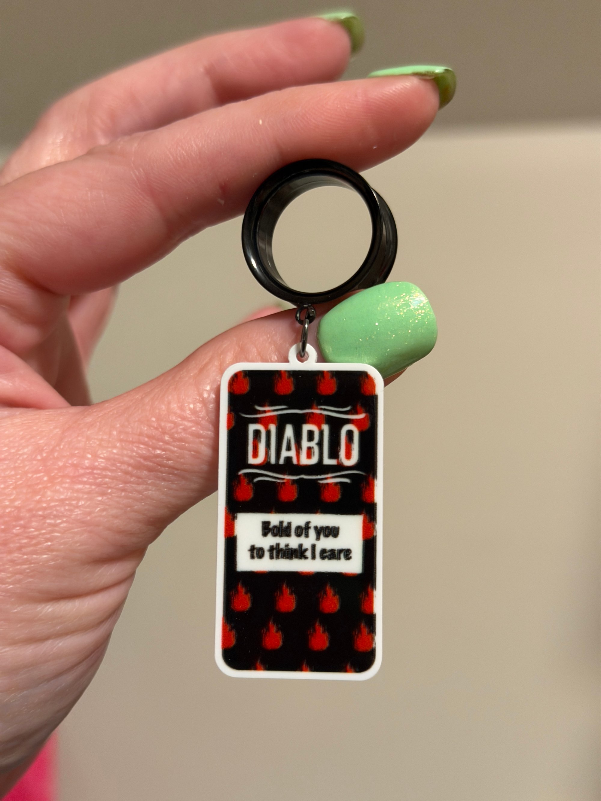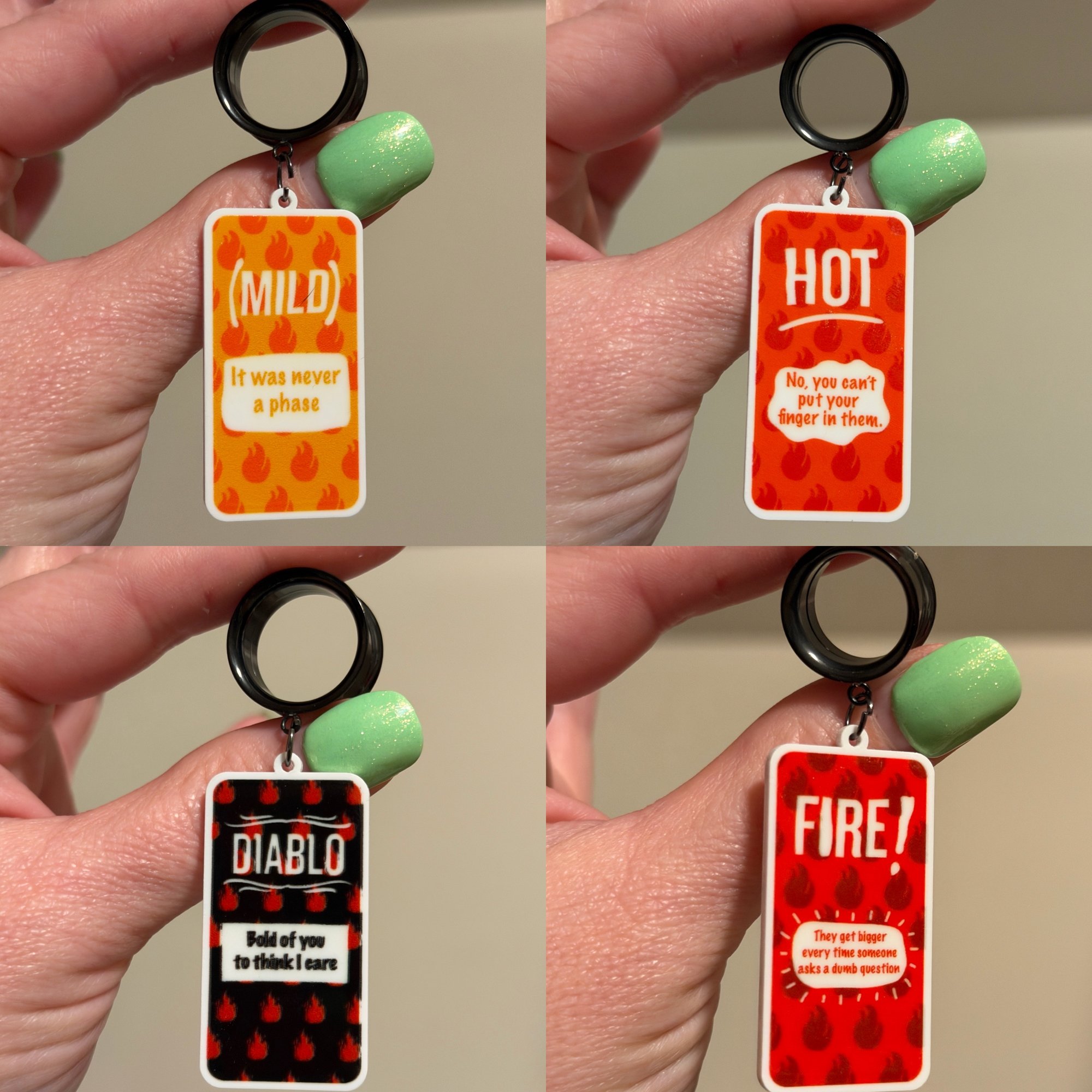 One pair of double flare surgical steel screw back tunnels with your choice of 4 hot sauce dangles!