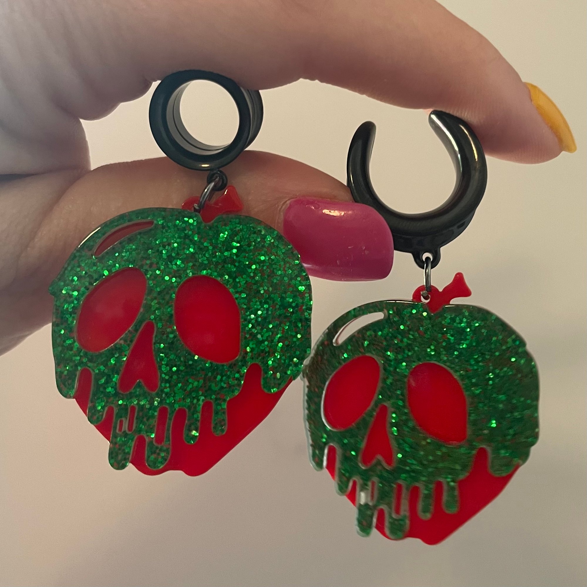 One pair of black surgical steel saddles/tunnels with a poison apple dangle!