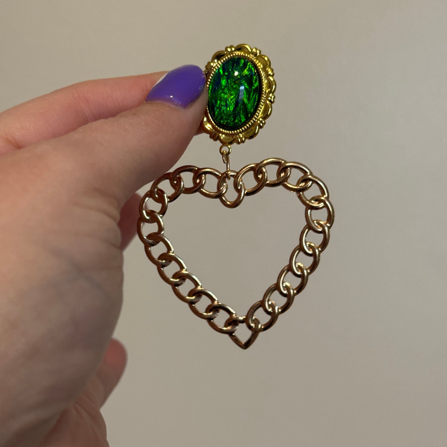 One pair of single flare surgical steel plugs (with o-rings) with a faux opal gem and chain heart dangle!