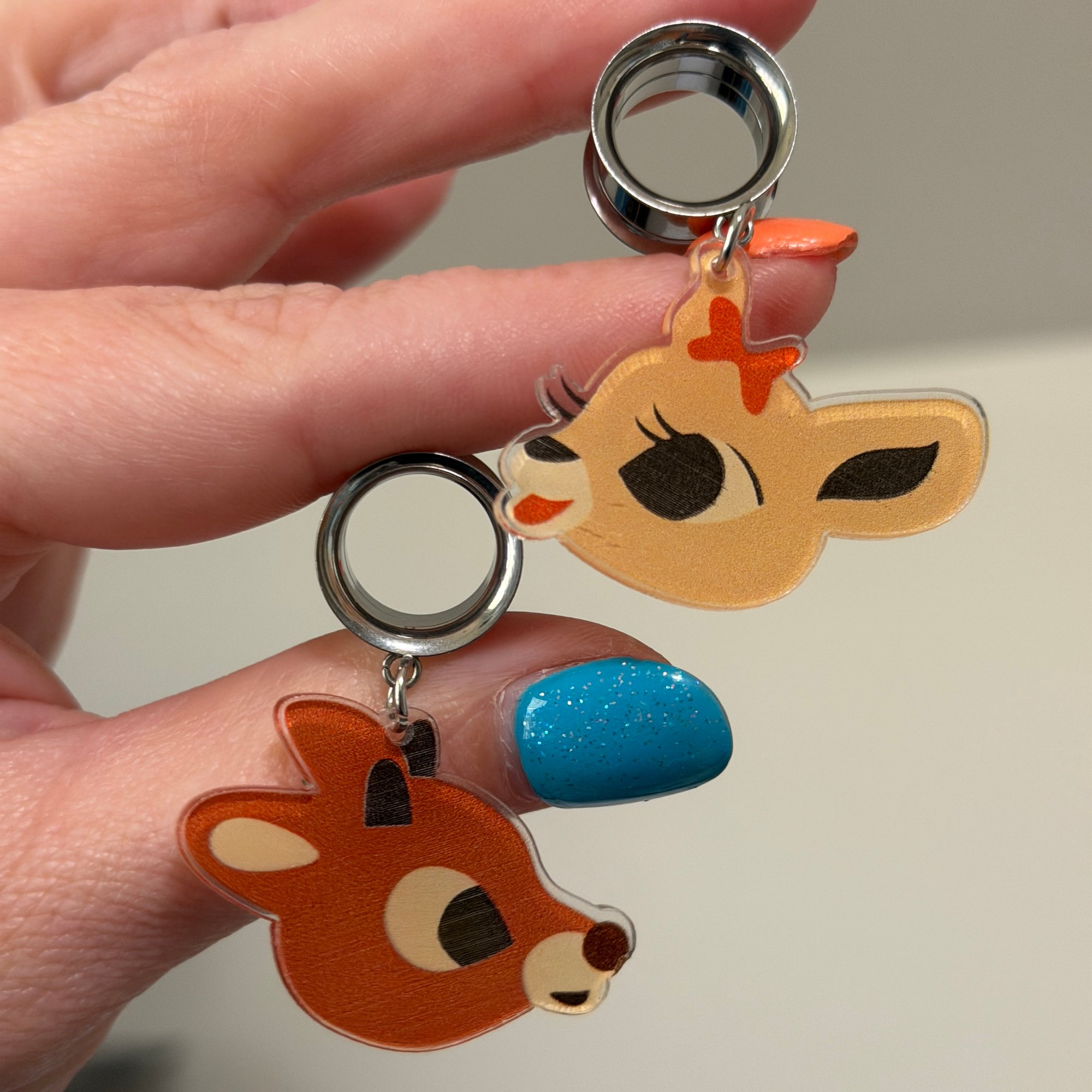 One pair of double flare surgical steel screw back tunnels with these adorable reindeer dangles!