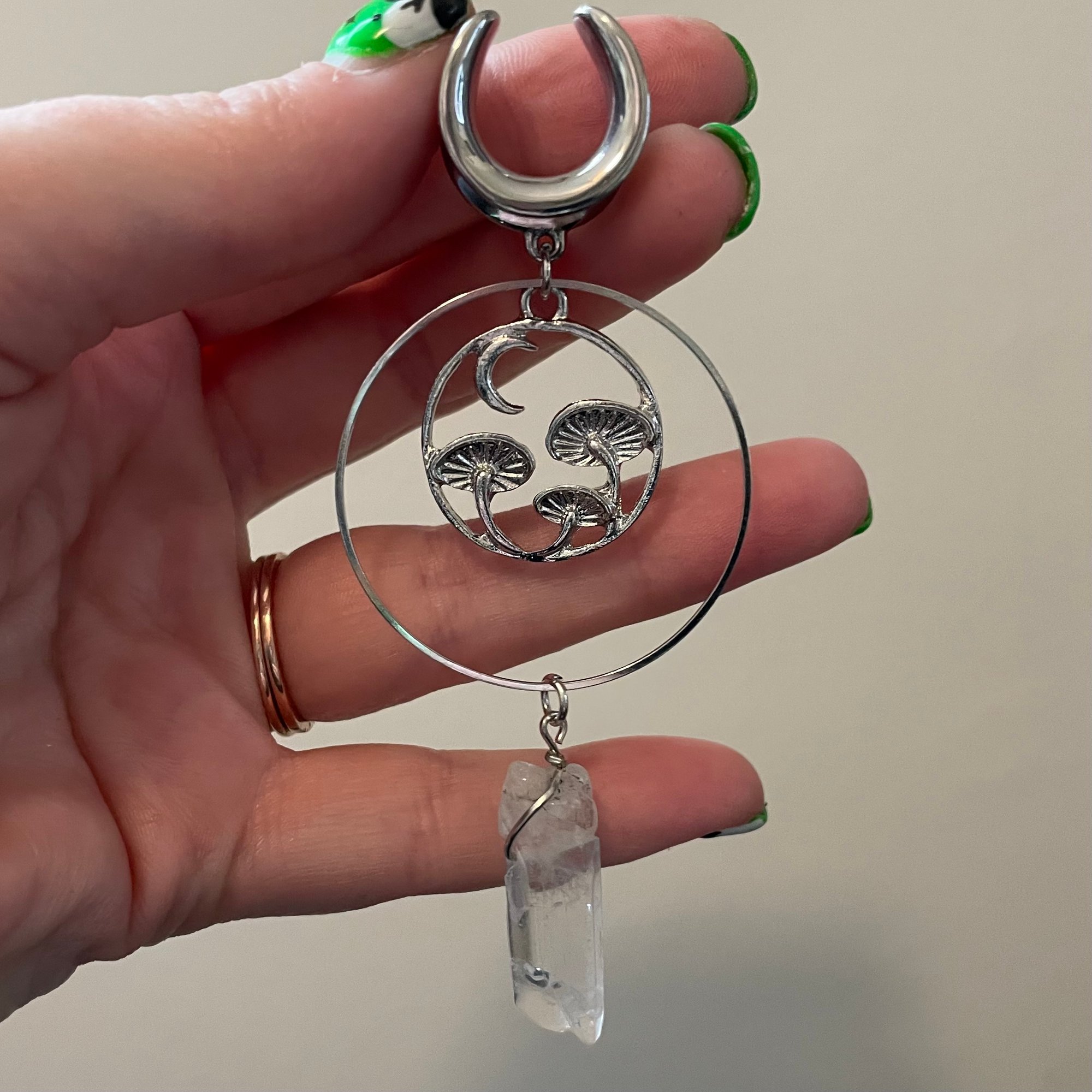 One pair of silver surgical steel saddles with this gorgeous mushroom crystal hoop!