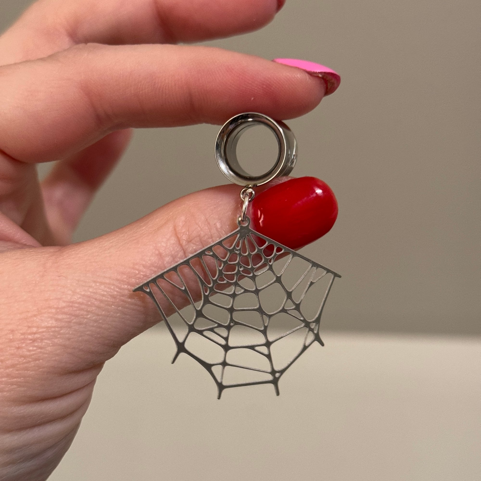 One pair of double flare surgical steel screw back tunnels with this very lightweight spiderweb dangle!